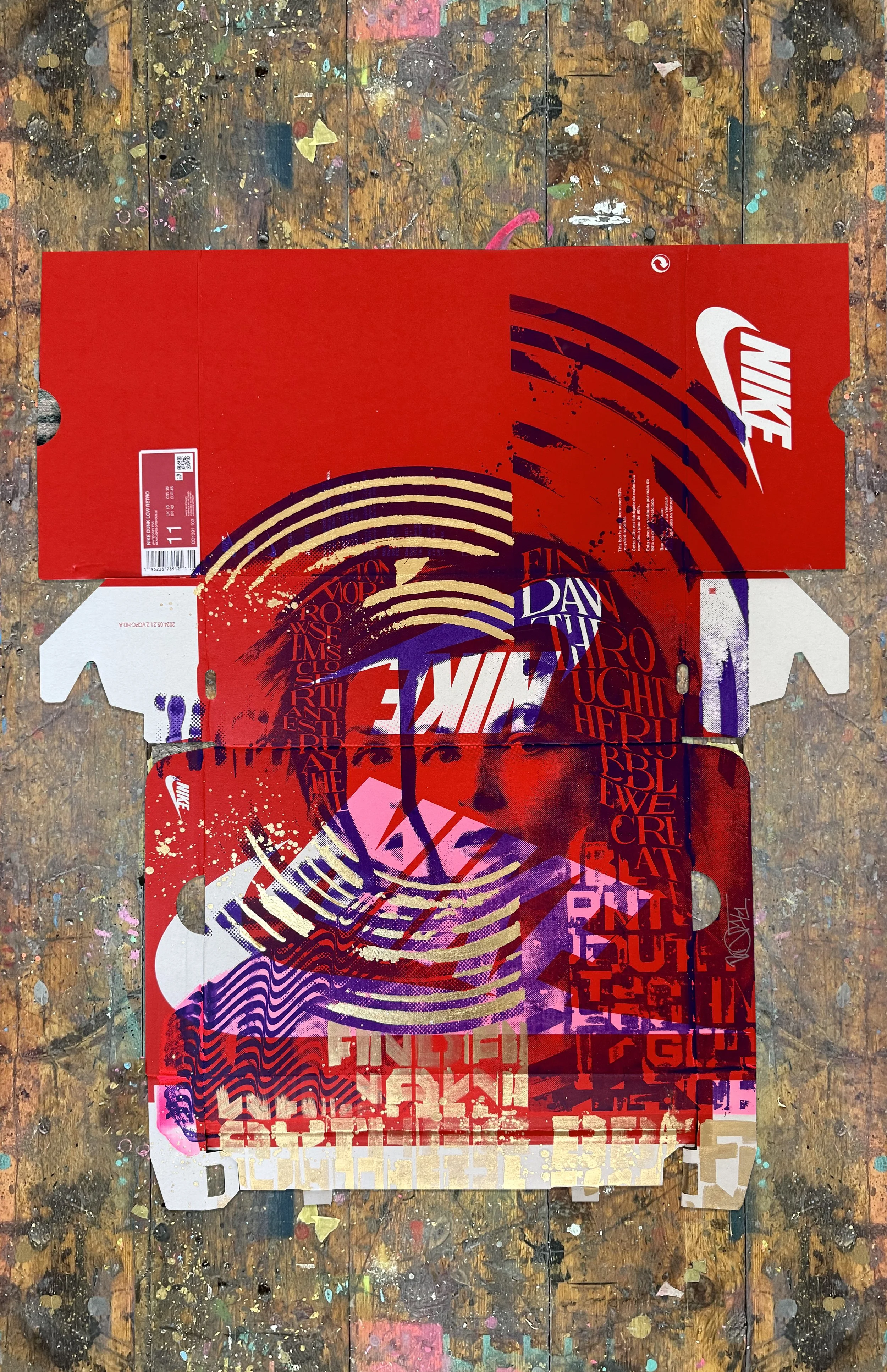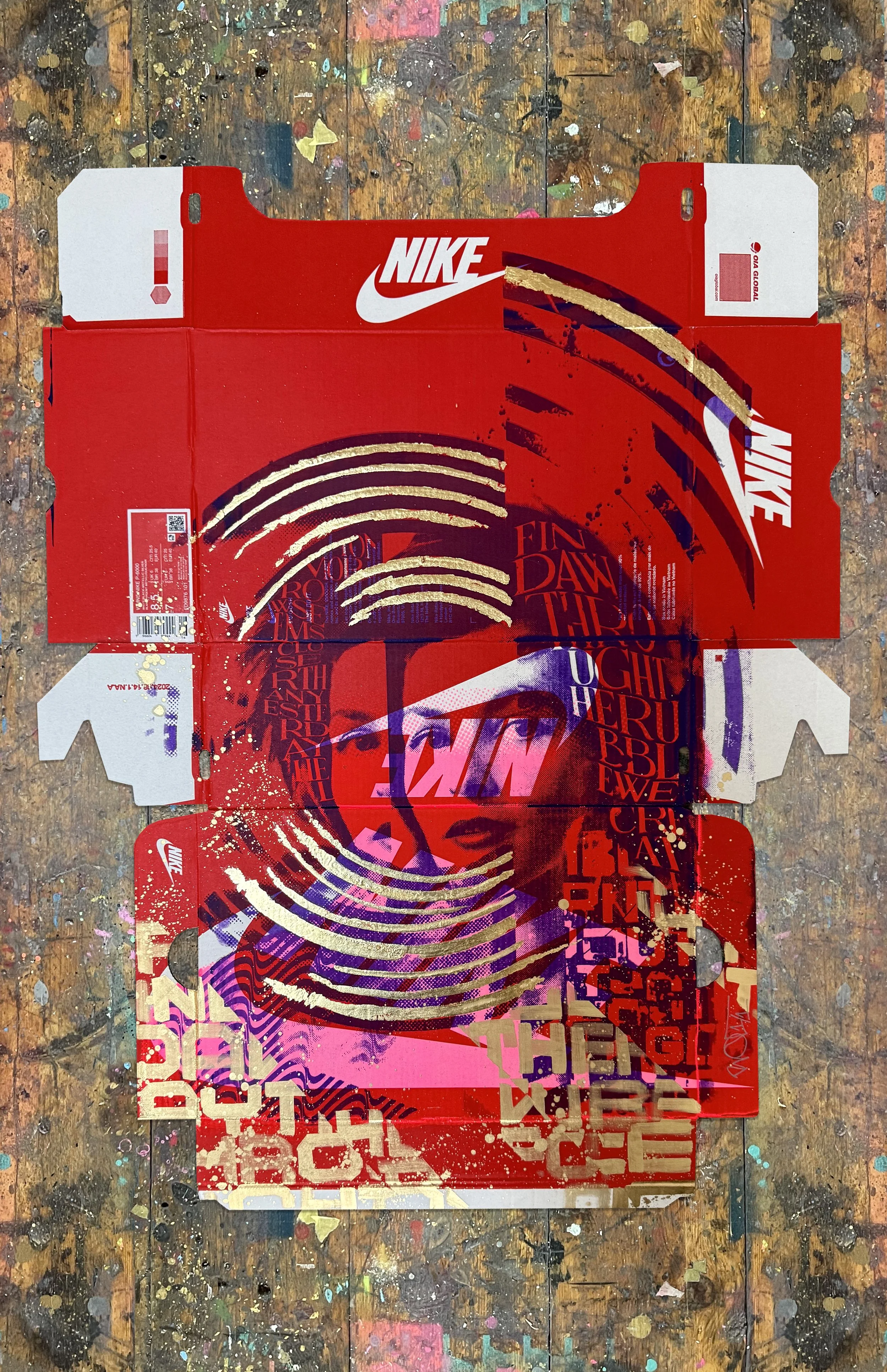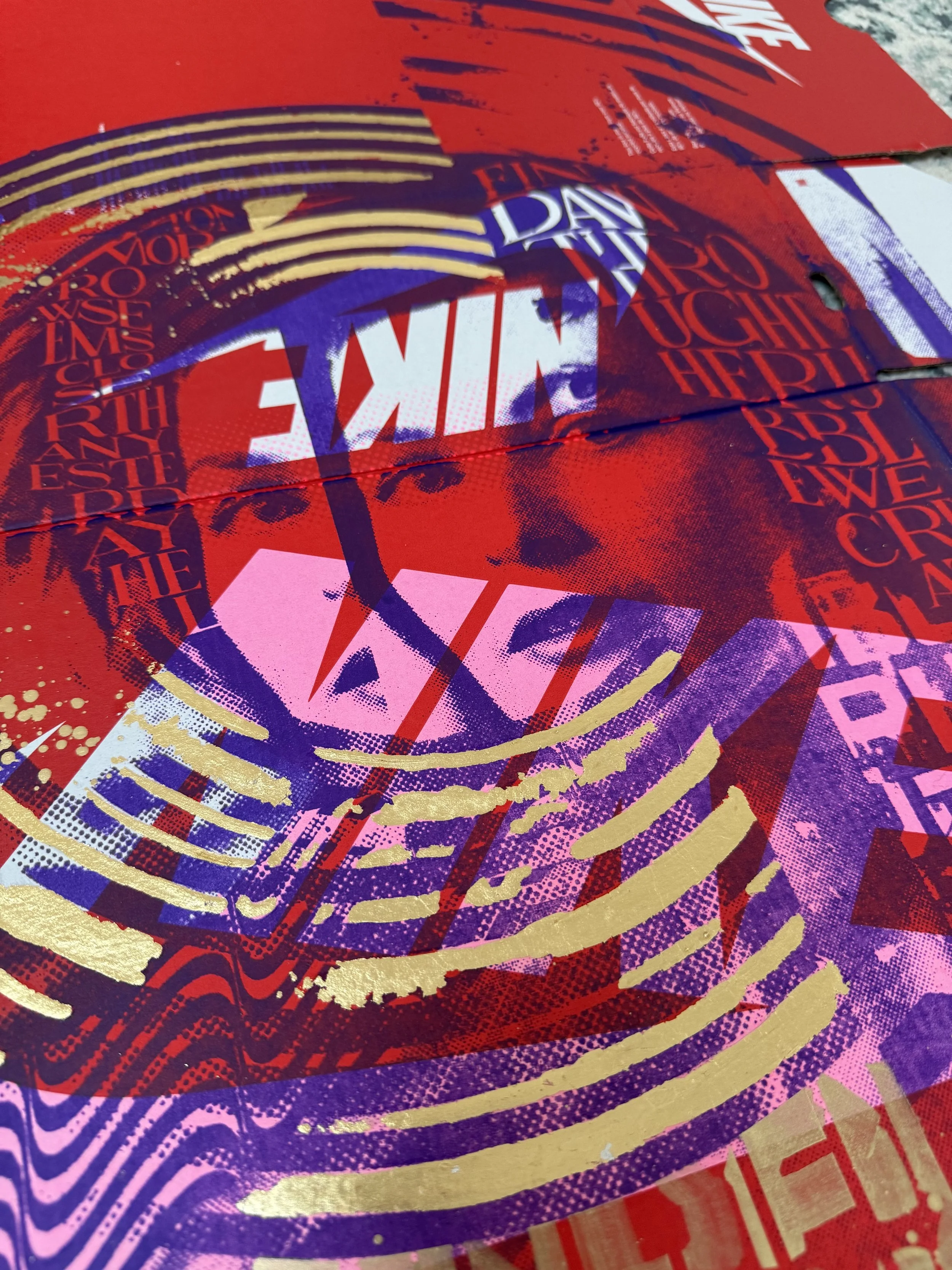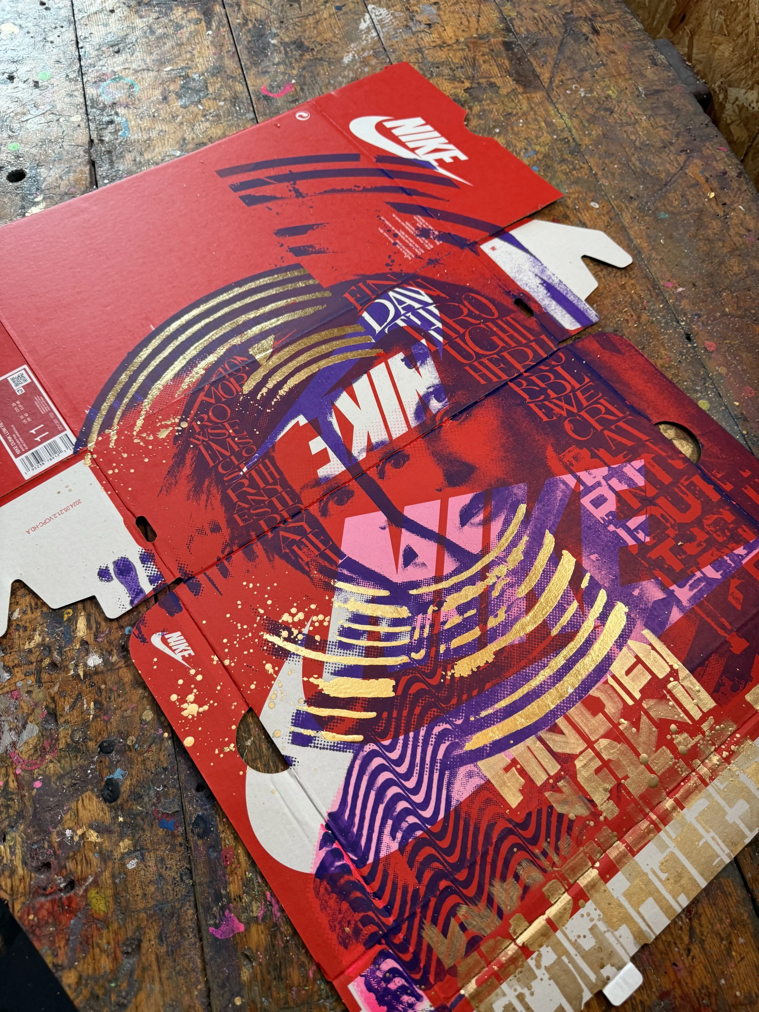 A fusion of analog and contemporary craftsmanship, this artwork is based on an original hand-cut collage, meticulously scanned and screen-printed in purple and pink onto an authentic Nike shoebox. The design is further elevated with hand-applied metallic gold lettering and intricate gold leaf detailing, making each piece truly unique.