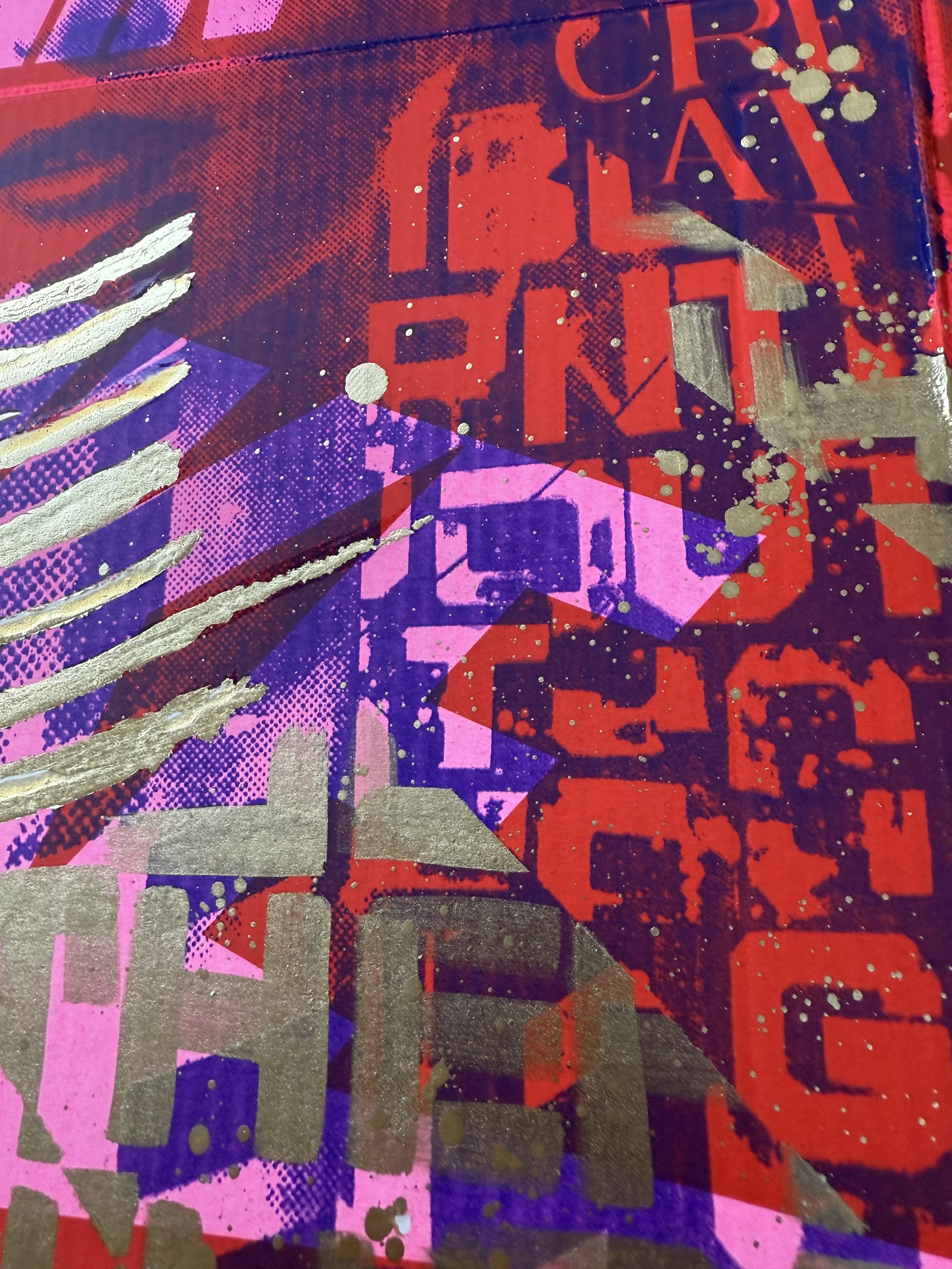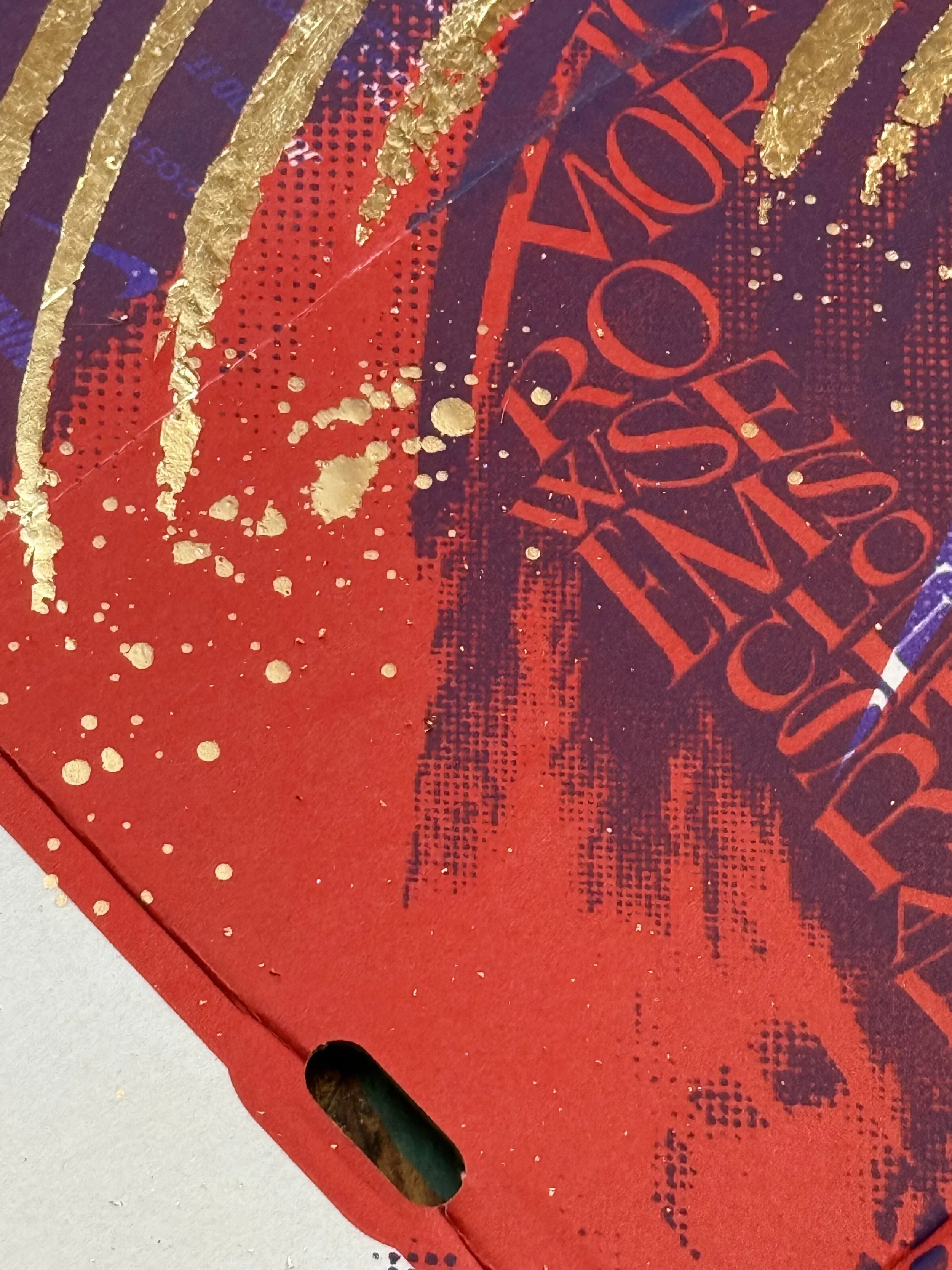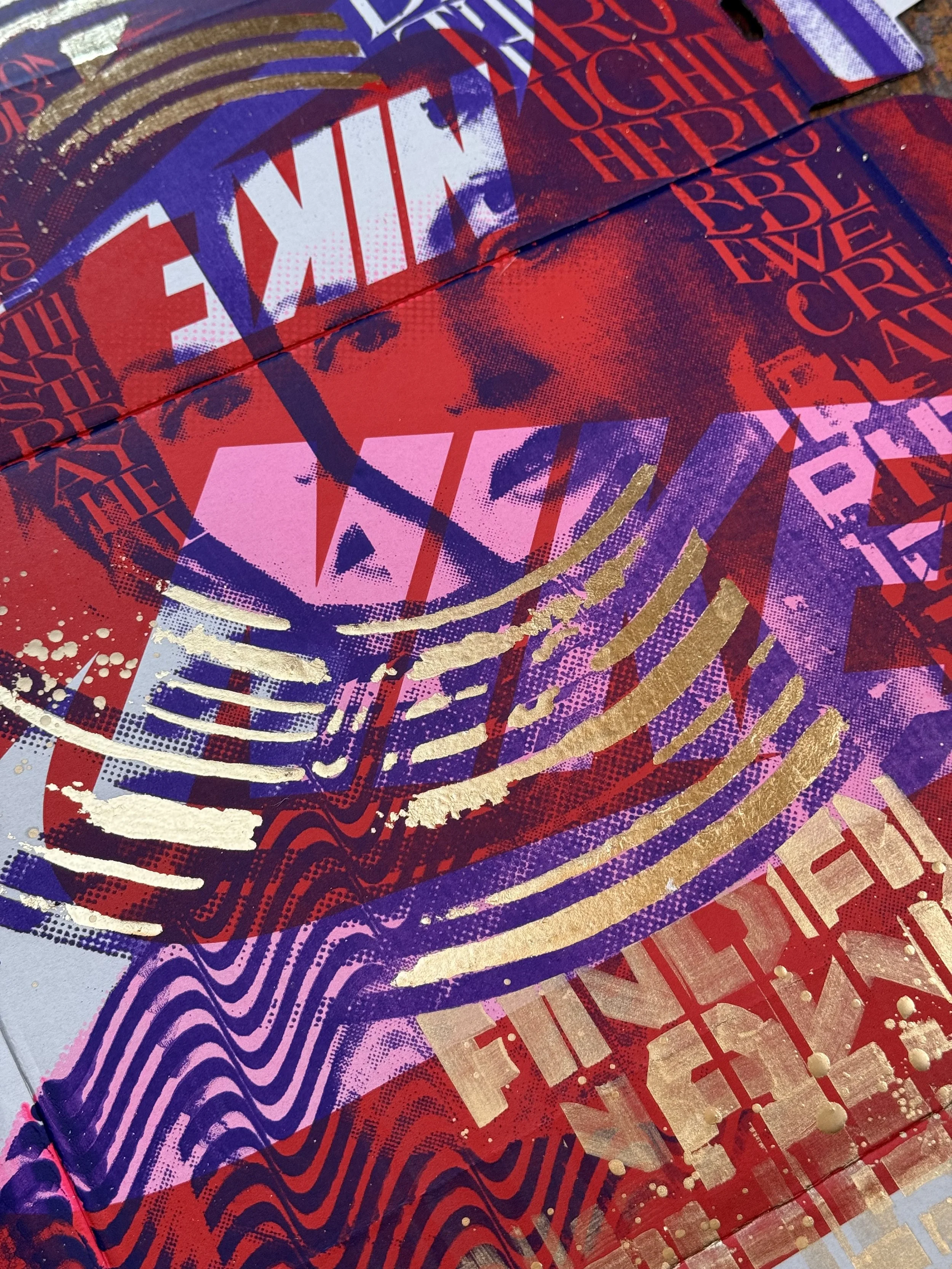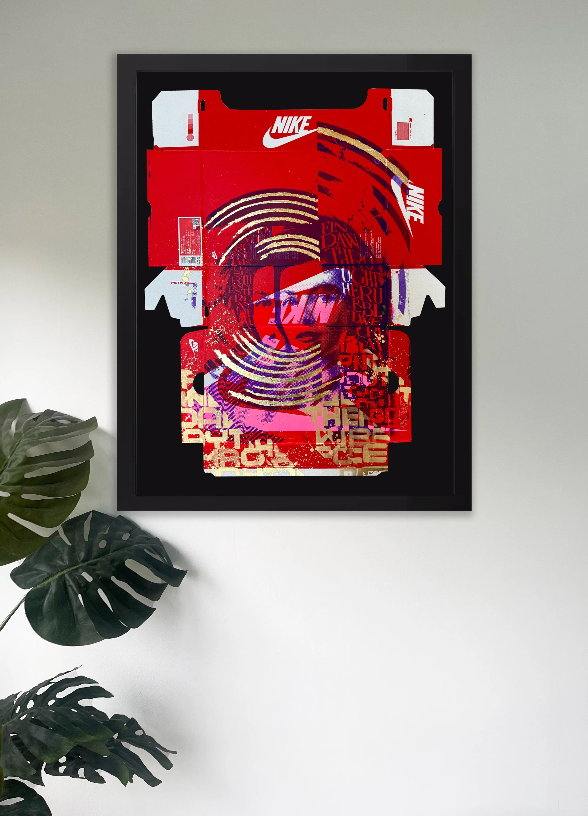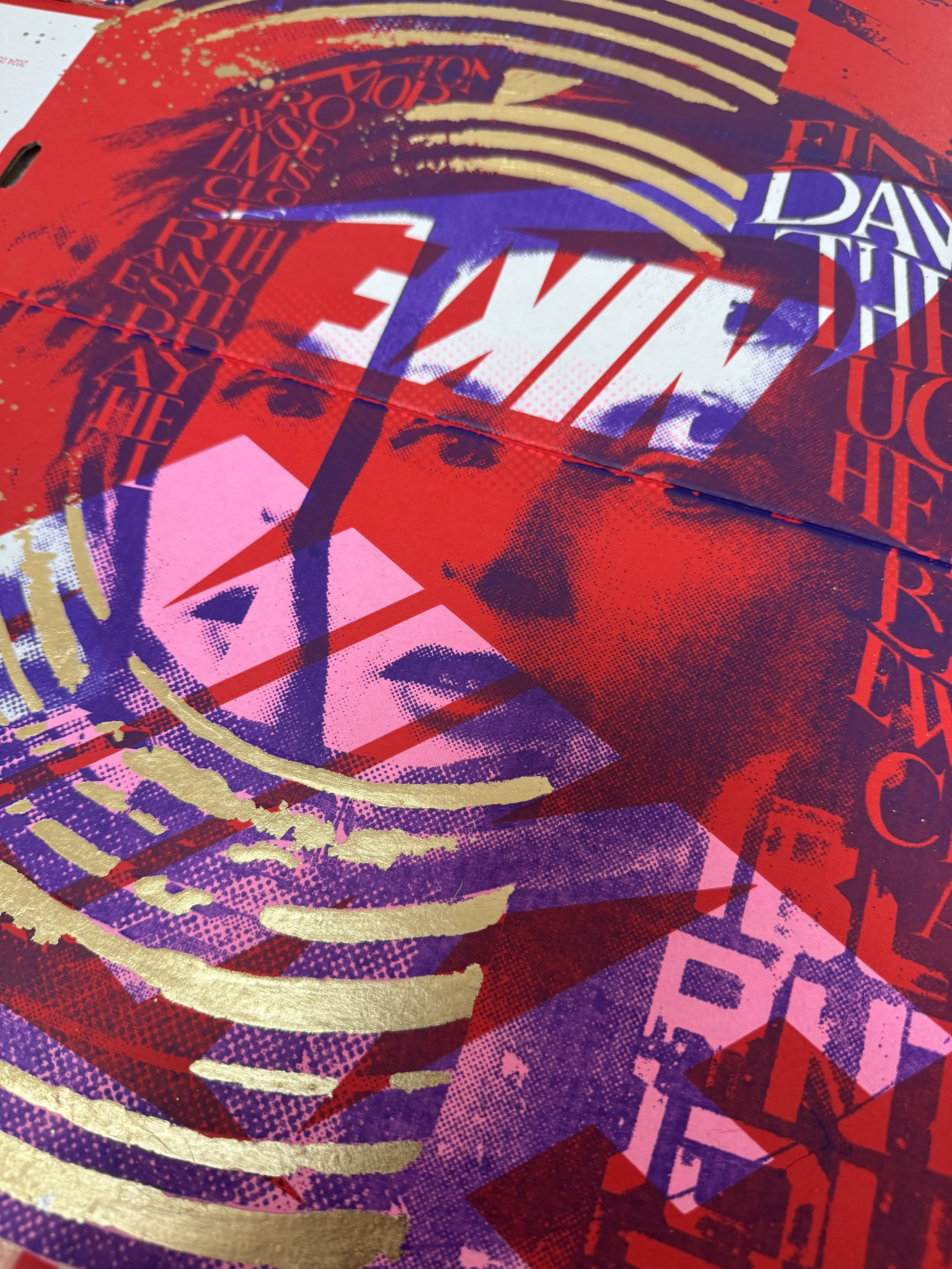 A fusion of analog and contemporary craftsmanship, this artwork is based on an original hand-cut collage, meticulously scanned and screen-printed in purple and pink onto an authentic Nike shoebox. The design is further elevated with hand-applied metallic gold lettering and intricate gold leaf detailing, making each piece truly unique.