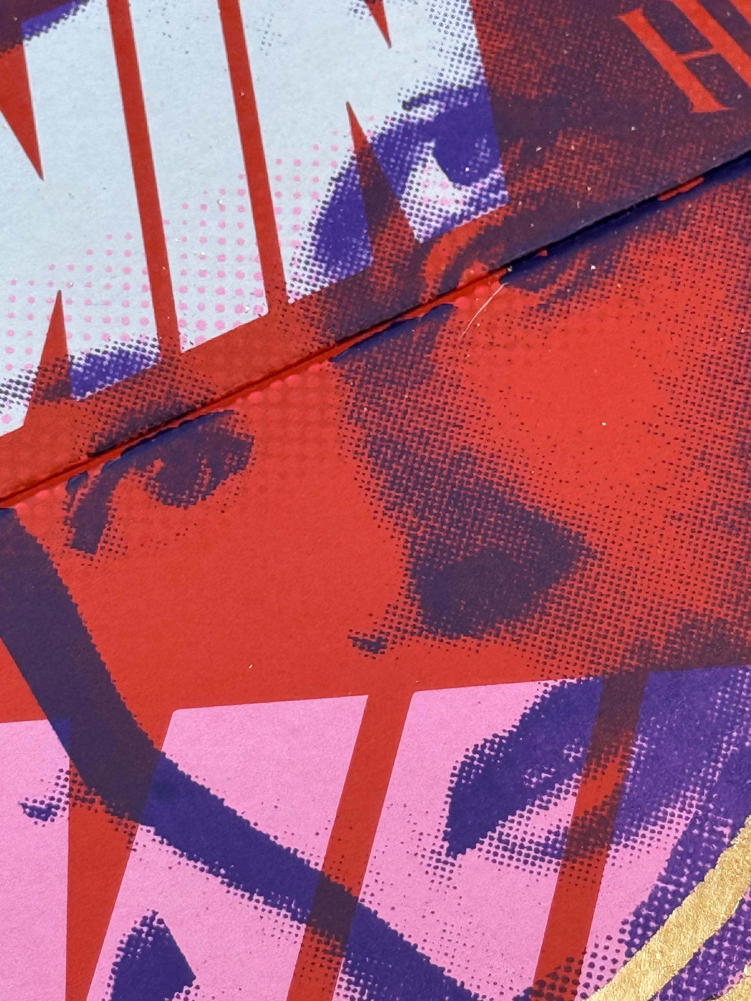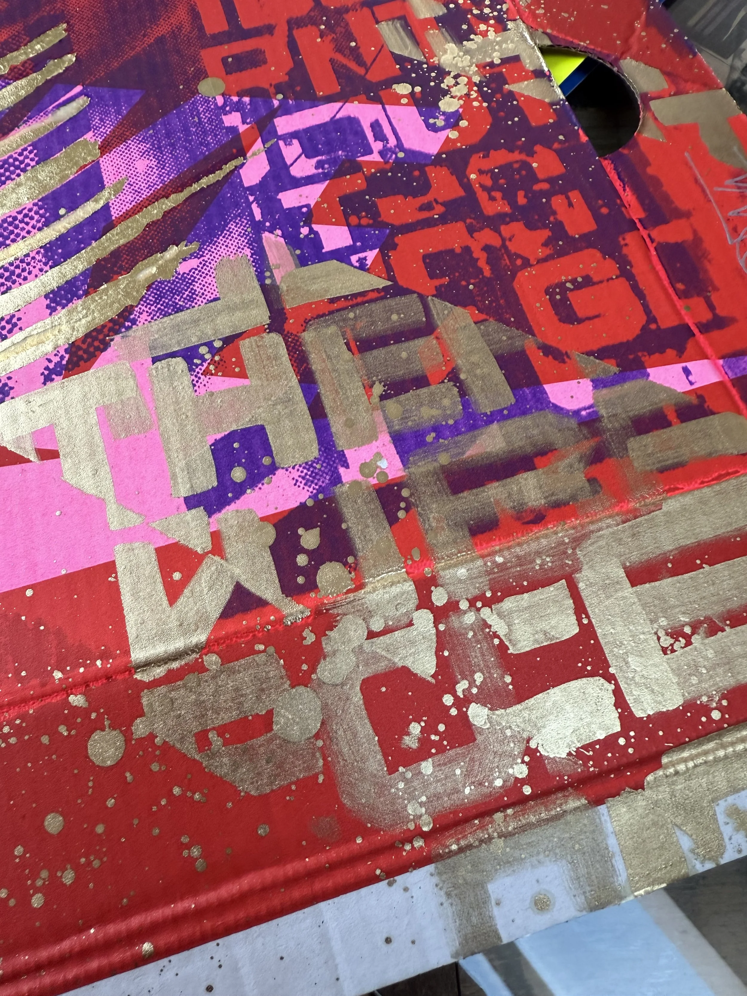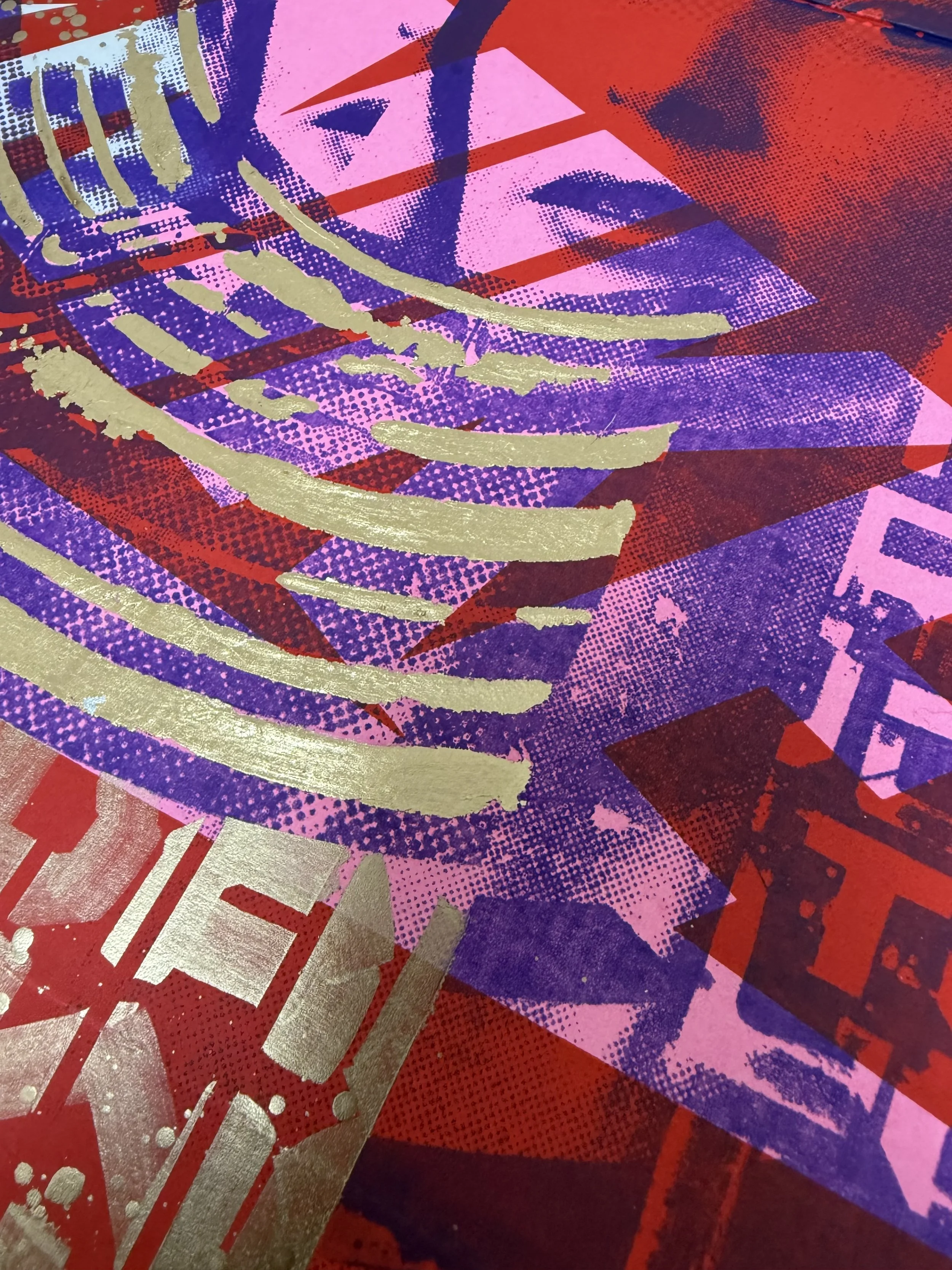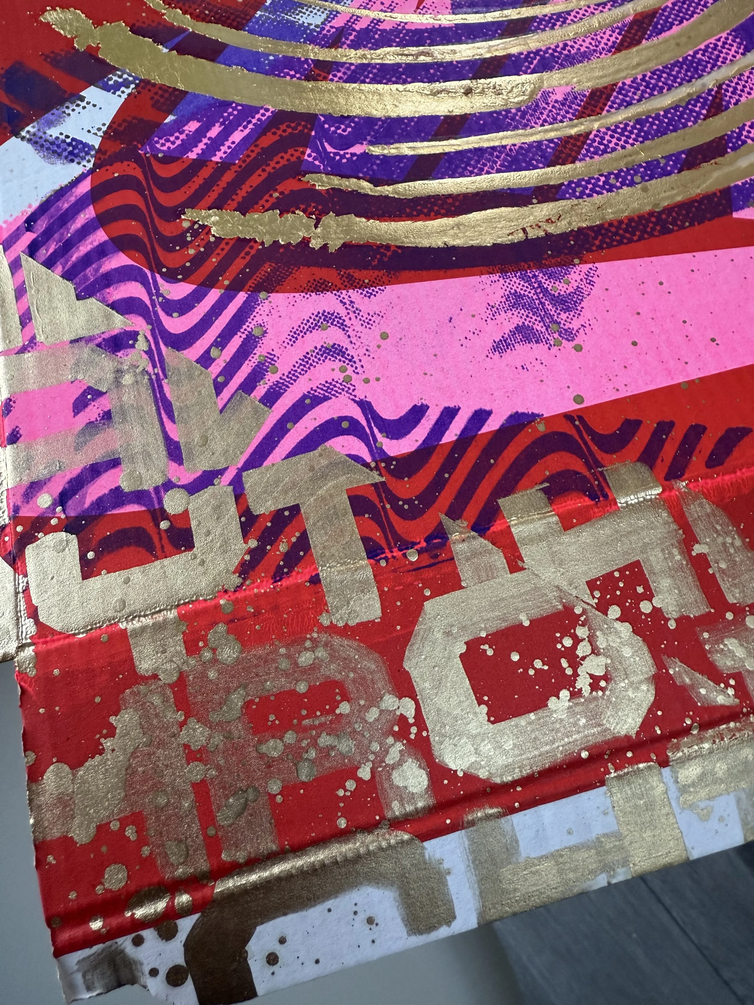 A fusion of analog and contemporary craftsmanship, this artwork is based on an original hand-cut collage, meticulously scanned and screen-printed in purple and pink onto an authentic Nike shoebox. The design is further elevated with hand-applied metallic gold lettering and intricate gold leaf detailing, making each piece truly unique.